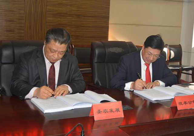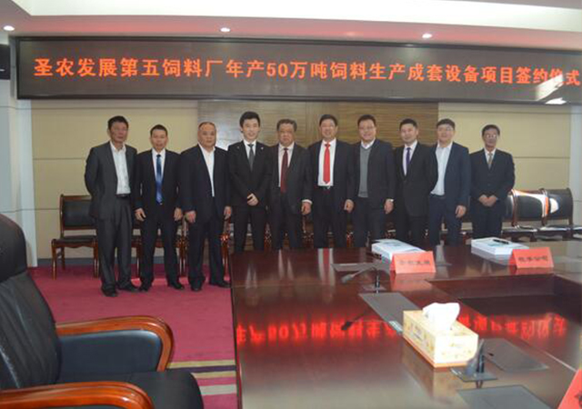 2016年12月10日,圣農(nóng)發(fā)展第五飼料廠年產(chǎn)50萬噸飼料生產(chǎn)成套設備項目簽約儀式在總部舉行。傅光明董事長同牧羊集團范天銘總裁共同簽署了合作協(xié)議。