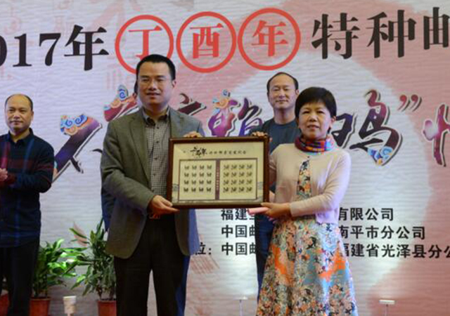 揭幕儀式由光澤縣人民政府、圣農(nóng)攜手中國郵政集團(tuán)公司光澤縣分公司聯(lián)合主辦,常務(wù)副總裁陳榕為首日封揭幕,并在首發(fā)式上講了話,她說郵票被譽(yù)為國家名片,是特殊的文化傳播媒介,而生肖是產(chǎn)生于我國的一種古老民俗文化現(xiàn)象。雞在中國十二生肖中排名第十,代表著誠信,象征著吉祥。特種郵票的發(fā)行,將有利于樹立圣農(nóng)企業(yè)新形象,促進(jìn)企業(yè)文化建設(shè)的提升,打造出企業(yè)對外交流的新載體。