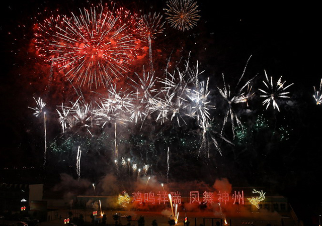 整場焰火晚會分“雞鳴祥瑞鳳舞神州”、“光明圣景”、 “圣農(nóng)騰飛”、“再創(chuàng)輝煌”四個樂章。一條條銀色飛龍在空中漫天飛舞,清脆的鳴叫聲響徹夜空,預(yù)示著又一年春天的到來。夢幻神奇的彩色花束,異彩紛呈的光柱,五光十色的焰火,構(gòu)成一幅幅激情四射、層次分明的動感組合,與圣農(nóng)多姿多彩的夜景交相輝映,給人壯觀震撼而又清純靚麗的感覺。