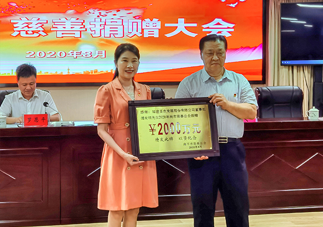2008年初,南平市慈善總會(huì)籌建期間,傅光明董事長(zhǎng)第一次向慈善總會(huì)捐贈(zèng)1000萬(wàn)元。2008年4月20日,南平市慈善總會(huì)召開成立大會(huì)和第一次會(huì)員大會(huì),他眾望所歸擔(dān)任會(huì)長(zhǎng),并被南平市政府授予“慈善家”稱號(hào)。會(huì)上,他承諾,將以每年1000萬(wàn)元的額度,向慈善總會(huì)連續(xù)捐贈(zèng)20年。此后,他一諾千金,2008年—2017年,每年捐贈(zèng)給慈善總會(huì)1000萬(wàn)元善款,累計(jì)達(dá)1億元。