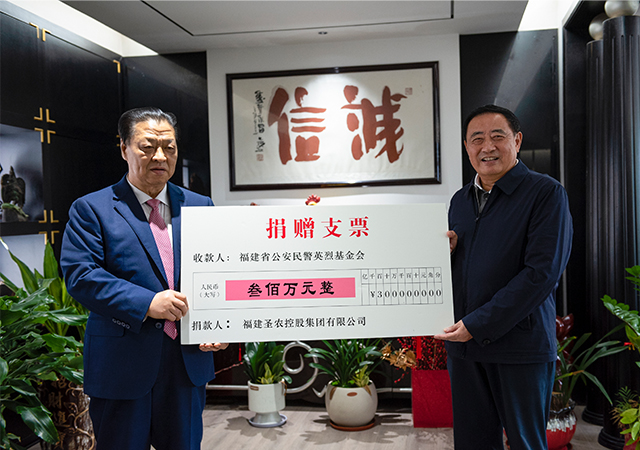 11月6日,圣農(nóng)集團創(chuàng)始人傅光明向福建省公安民警英烈基金會捐贈300萬元。福建省公安民警英烈基金會理事長李堅一行專程來到圣農(nóng)集團,向集團創(chuàng)始人傅光明頒發(fā)榮譽理事長證書。
