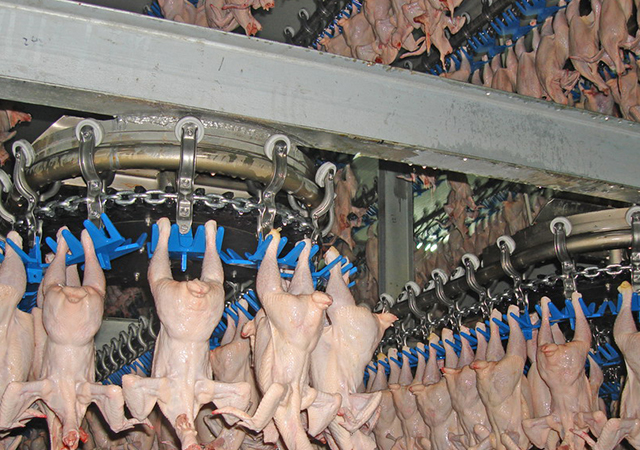 肉雞被放血后,進(jìn)入屠宰流程,自動(dòng)脫毛、自動(dòng)去頭、自動(dòng)去爪、自動(dòng)掏膛。整個(gè)流程全部采用從丹麥Linco公司引進(jìn)的、全球先進(jìn)的自動(dòng)化肉雞屠宰線及加工設(shè)備:自動(dòng)切割轉(zhuǎn)掛系統(tǒng)可同時(shí)自動(dòng)切下雞爪、雞頭,并自動(dòng)將雞只從屠宰線轉(zhuǎn)掛到掏膛線上;自動(dòng)掏膛及清洗系統(tǒng)可自動(dòng)分選和分離內(nèi)臟和心肝,提高了生產(chǎn)效率和產(chǎn)品衛(wèi)生水平。自動(dòng)化設(shè)備節(jié)省了大量勞動(dòng)力,流水線上只需配備幾名檢驗(yàn)人員,對(duì)不合格產(chǎn)品進(jìn)行剔除。